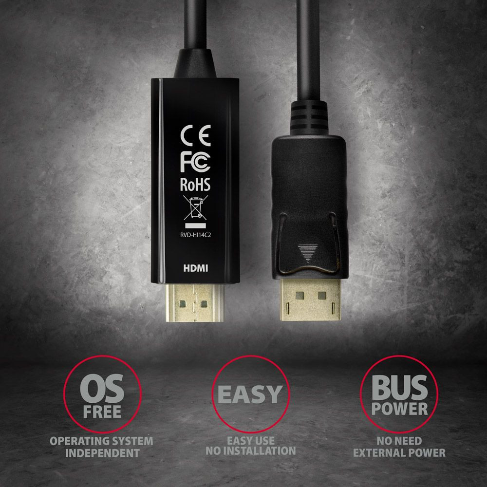 Az AXAGON RVD-HI14C2 DisplayPort -> HDMI aktív kábel - adapter összeköti a HDMI monitor/TV/projektort a számítógéppel a DisplayPort kimenet segítségével.