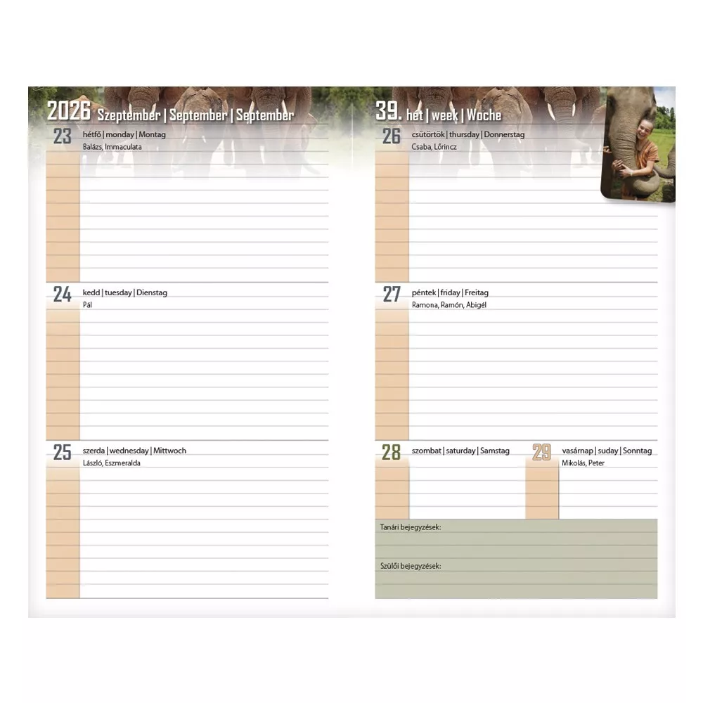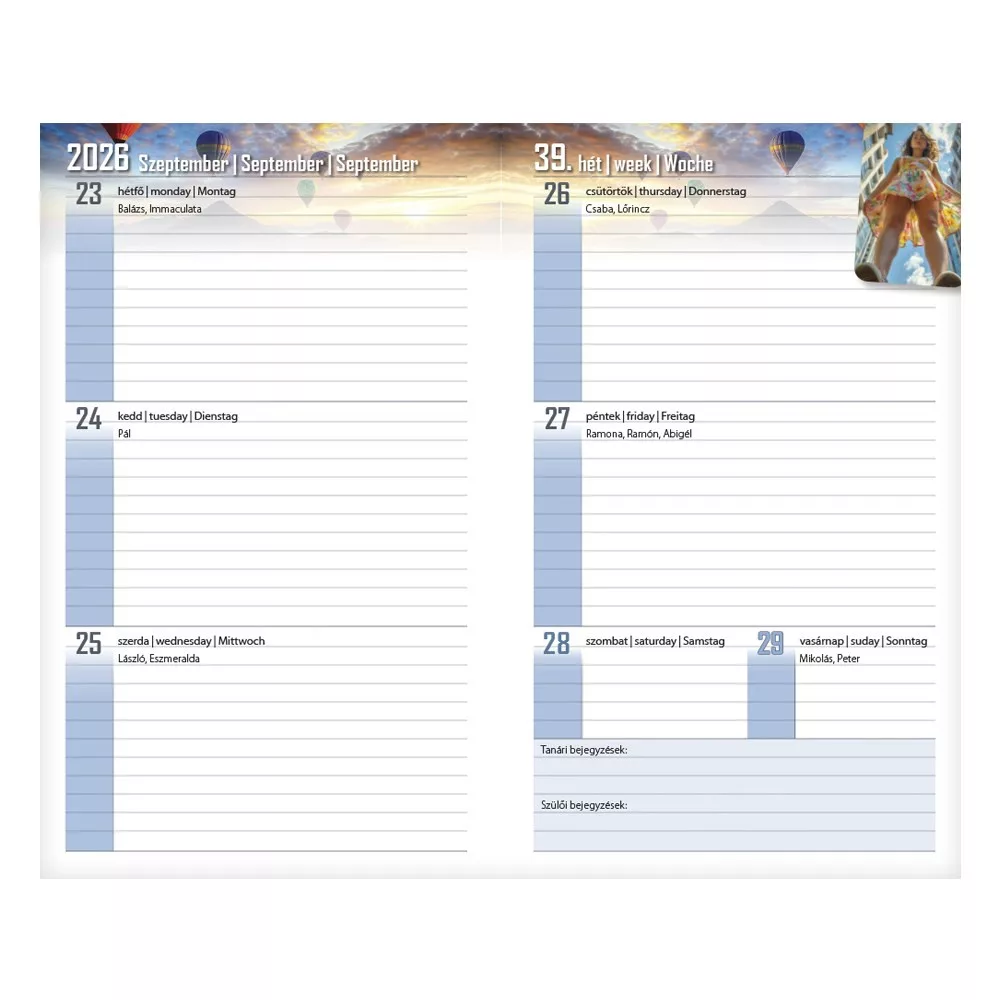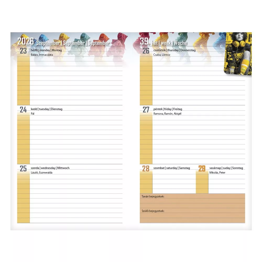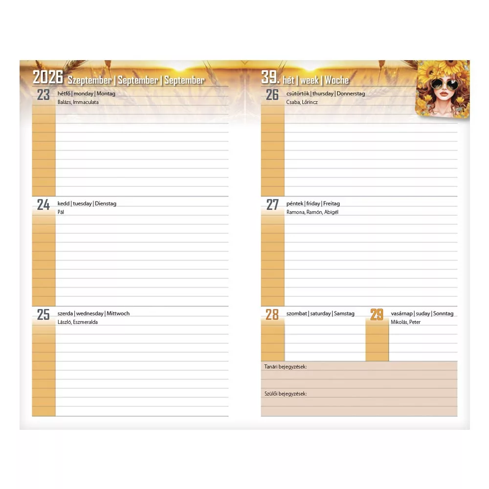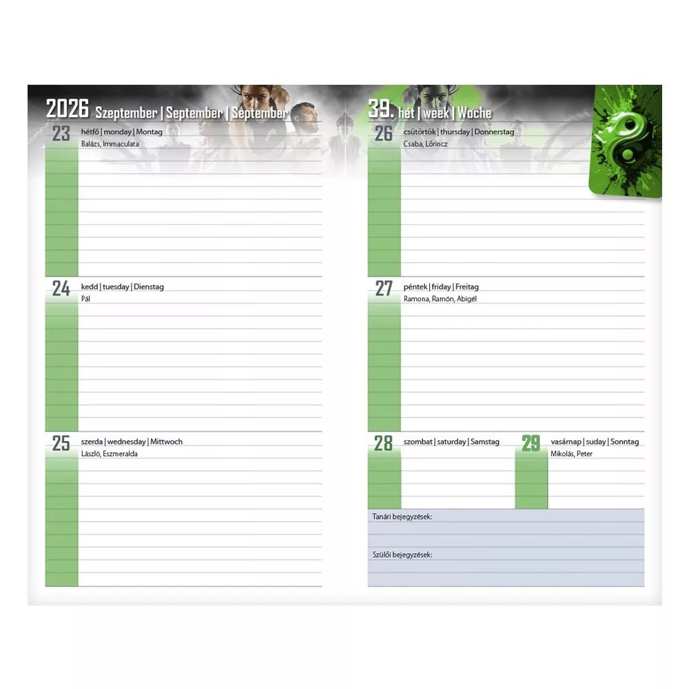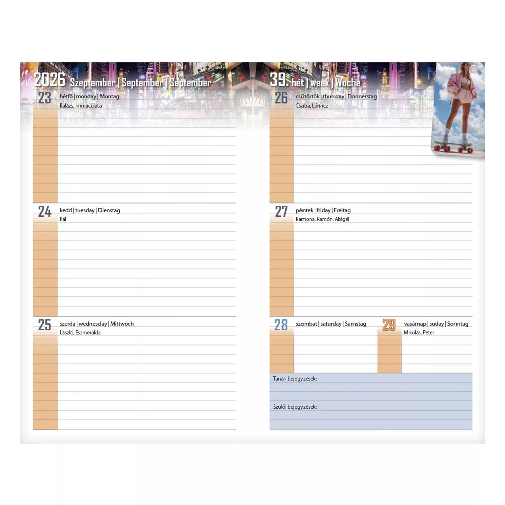 Tartalom: 10 oldal információs blokk, osztálynévsor, tanárok, szabadidős és egyéb programok rögzítésére alkalmas táblázatok, 108 oldal heti beosztású naptár(2026. augusztus 18-tól 2027. augusztus 23-ig), 10 oldal ismeretterjesztő lap, irodalom, történelem, matematika, fizika és angol nyelv témában.
