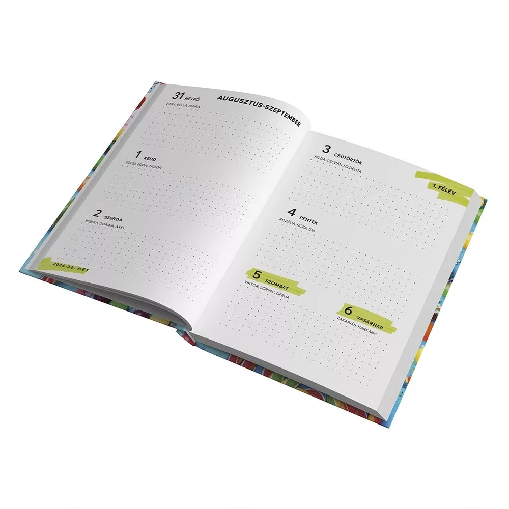 B6 Diáknaptár, heti beosztású 160 oldal terjedelemmel , 2026. augusztustól 2027. augusztusig, plusz oldalakkal ( órarend, jegyzet, játék lapok ). Flexibilis táblával matt fóliázott papírborítóval, 3D UV lakkal felületkezelve.