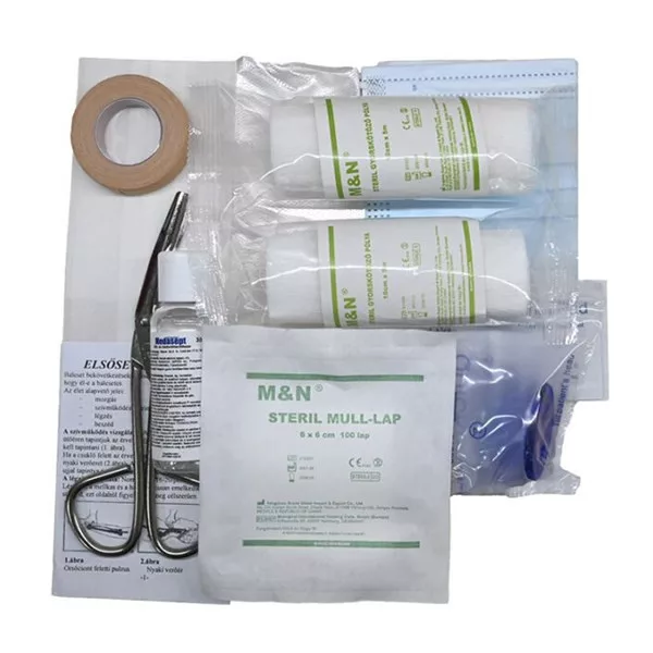 Tartalma: Steril gyorskötöző pólya (10cmx5m) 2db, steril mull lap (6cmx6cm/100lap) 1db, kéztisztító lap 4db, fóliakesztyű 1 pár, ragtapasz (1,25cmx5m) 1 tekercs, kötszervágó olló 1db, fertőtlenítő oldat (30ml) 1db, vágható sebtapasz (6cmx10cm) 2db, higiénikus arcmaszk lélegeztetéshez 1db, gumis rögzítésű sebészeti szájmaszk 1db, elsősegélynyújtás képekben 1db, tartalomjegyzék 1db.