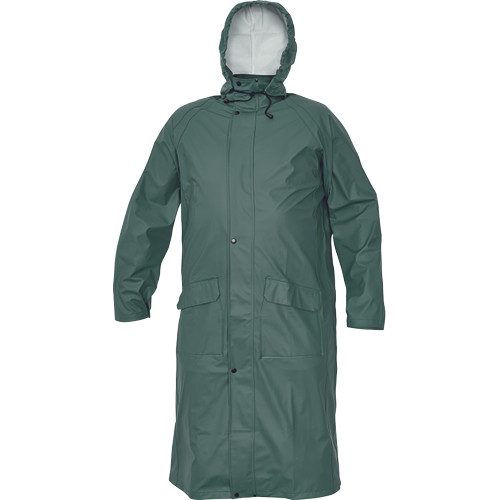 Vízálló 3-es kabát gallérba rejtett kapucnival, 120 cm hosszú, vízoszlop magasság 2000 mm. Fedett cipzárral és és fedett zsebbel. Könnyű, szakadásmentes, kellemes érintésű és rugalmas alapanyag.