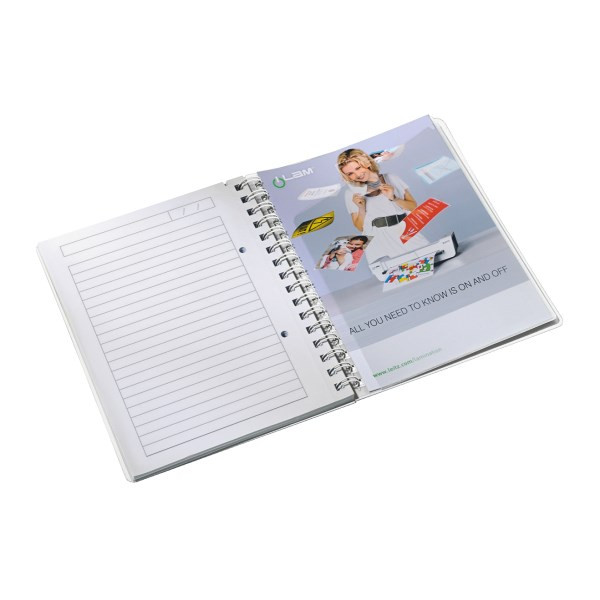 Spirálfüzet lefűzhető tasakkal és pólyás mappával a különálló lapok számára.