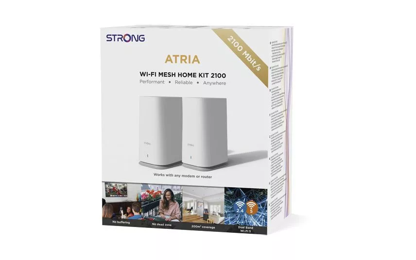 A legkorszerűbb Easy Mesh megoldás használatával, a STRONG Wi-Fi Mesh Home Kit 2100 a Mesh technológiával és az erőteljes 5 MU-MIMO Wi-Fi szabvány kombinációjával maximális sebességet, lefedettséget biztosít otthoni hálózatához. Ez a csomag mely 2db ATRIA Mesh Extender 2100 egységet tartalmaz, helyettesíti a jelenlegi Wi-Fi hálózatát a meglévő modem vagy router cseréje nélkül. Szuper gyors és akadás mentes barangolást biztosít a Wi-Fi hálózaton akár 2100 Mbit/s sebességgel, akár egészen 200m2-es lefedettséggel.A lakóhelye méretétől függően, hozzáadhat további 4db ATRIA Mesh Extender 2100-at (6db ATRIA Mesh Extender 2100 akár 600m2-es lefedettséget is biztosíthat). Kezelje a Wi-Fi Mesh Hálózatát az ATRIA Alkalmazással amely elérhető Android és iOS eszközön.