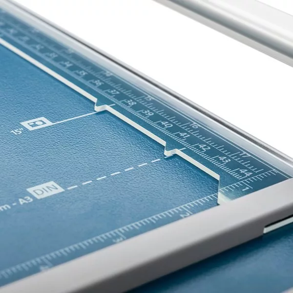 Praktikus körkéses vágógép DIN A3 vágási méretig. Stabil fém asztal csúszásgátló gumitalpakkal, amely lehetővé teszi a körkéses vágógép biztonságos rögzítését. A vágóél mentén mm-es méretbeosztással ellátott vezetővonalak könnyítik meg a vágandó anyag igazítását. Biztonságos, vágófejbe épített csiszolt önélező acél forgópenge. Alsó acélpenge. Zárt, műanyag vágófejbe épített forgópenge. Lapleszorító hasznos jelölésekkel. A vágandó anyag automatikusan rögzül a vágóél mentén. Két méretjelző sáv mm-es léptékkel segíti a pontos, 90°-os vágást. Könnyen cserélhető vágófej.
