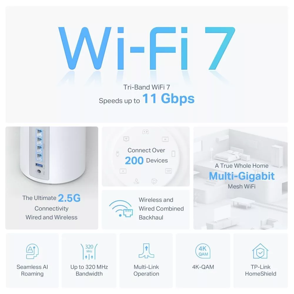 WI-FI 7 (802.11be), 4xLAN, 2,5Gbps LAN, 2,4GHz 574Mbps, 5GHz 4320Mbps, 6GHz5760Mbps, Tri Band, Mesh WI-FI, USB