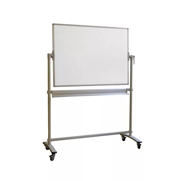 Átfordítható, mobil, mágneses tábla, eloxált(rozsdamentes) aluminium kerettel. Lakkozott fehér borítás, toltartó tálcával, fém állványon, mobilitását 4 gumi görgő teszi lehetővé, melyek mindegyike blokkolóval van ellátva, a stabilitás érdekében. Mágneses jelölők használatához kiváló melyek, segítségével papírlapokat lehet rögzíteni a táblához.